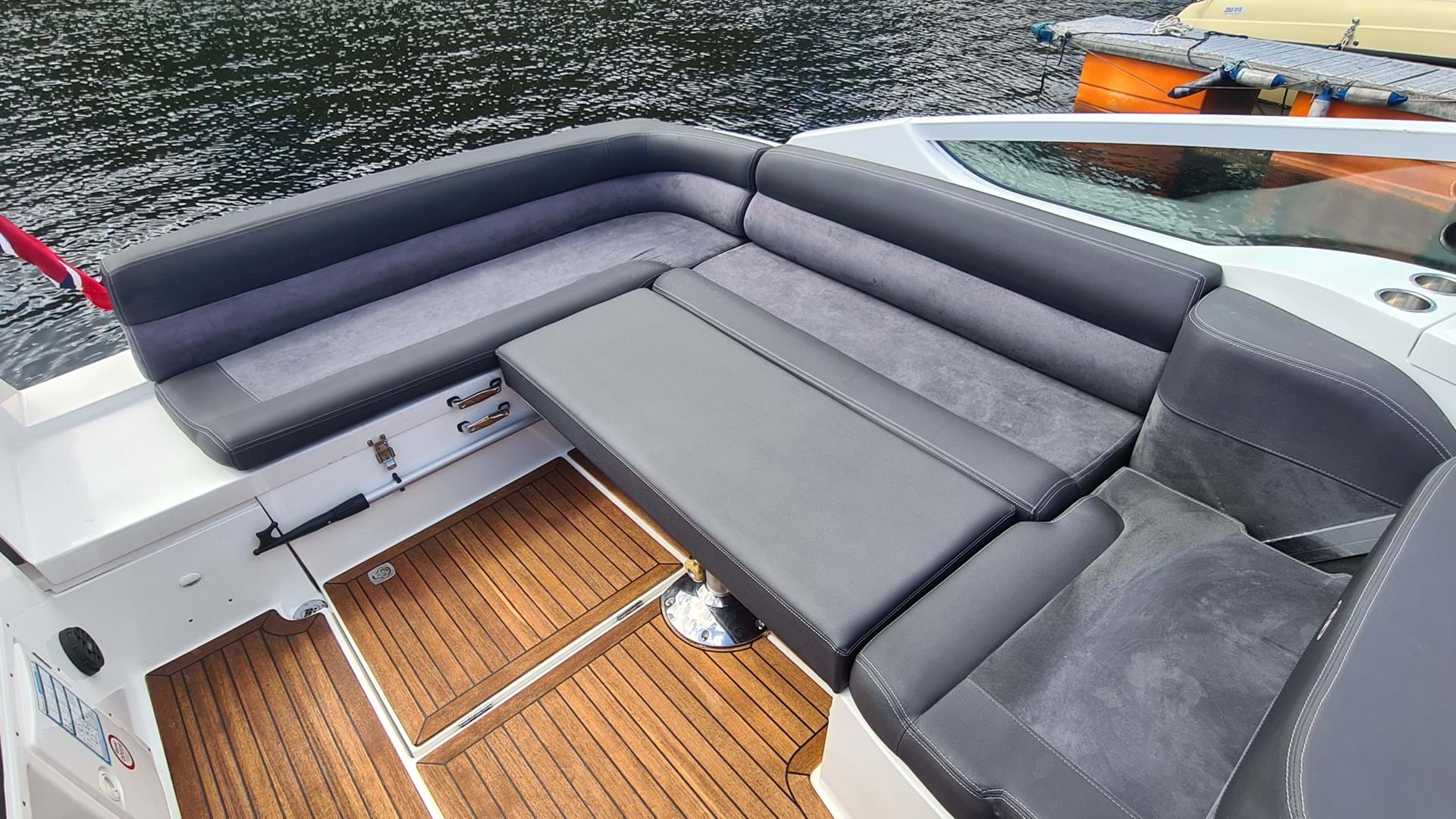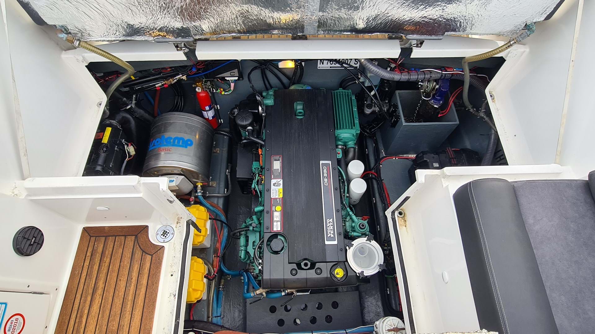 "The Volvo Penta D6 is a powerful 5.5-litre turbo diesel engine producing 330 hp, paired with a DPH sterndrive with duo prop. The maximum RPM is 3600, giving the boat a top speed of over 40 knots. The engine has a fantastic sound and enormous torque, making the boat incredibly fun to drive. It's very economical in fuel consumption; at cruising speed, it uses significantly less fuel than equivalent outboard engines, and the cost of tax-free diesel is also much lower than petrol, making the running costs very manageable."
