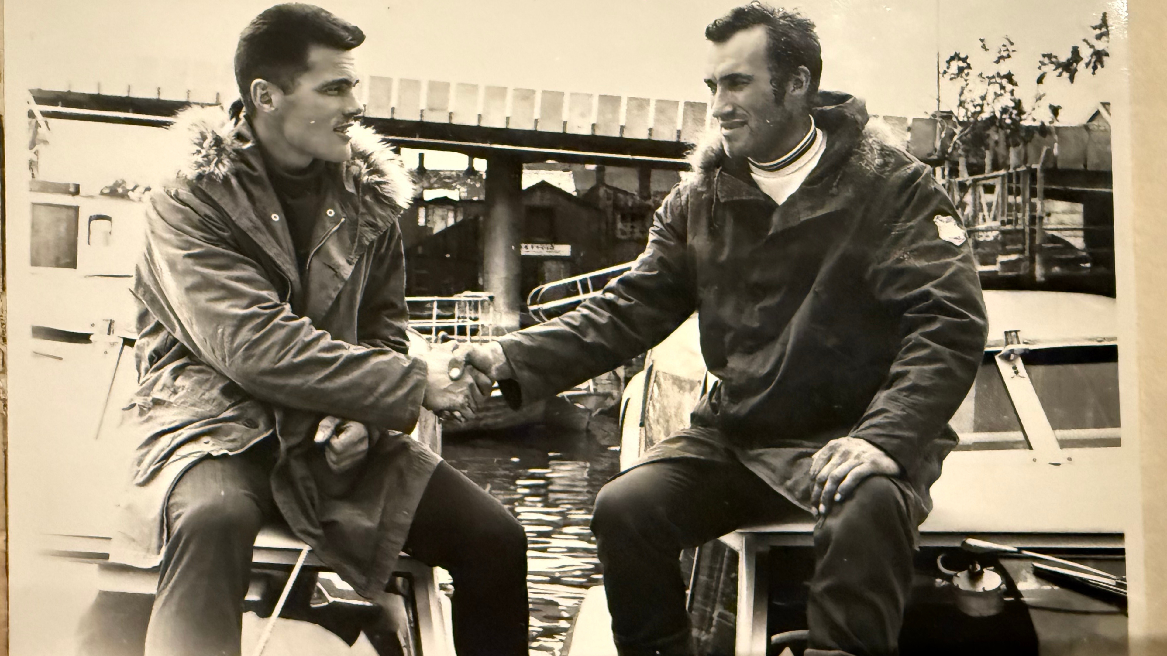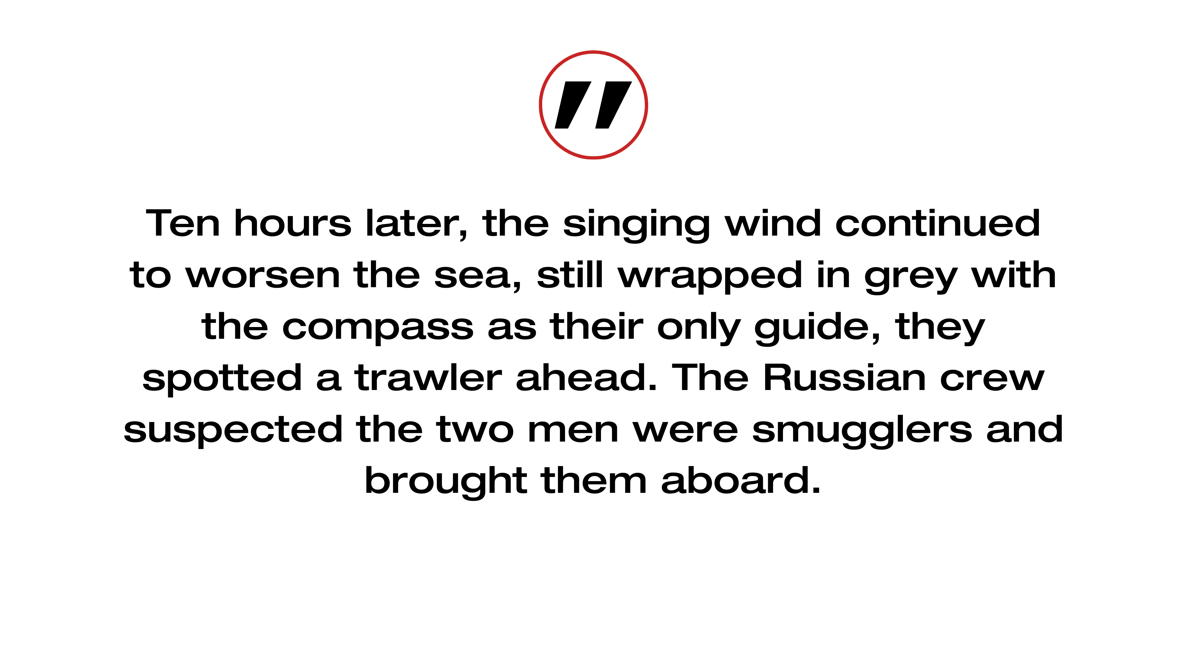 Ten hours later, the singing wind continued to worsen the sea, still wrapped in grey with the compass as their only guide, they spotted a trawler ahead. The Russian crew suspected the two men were smugglers and brought them aboard.