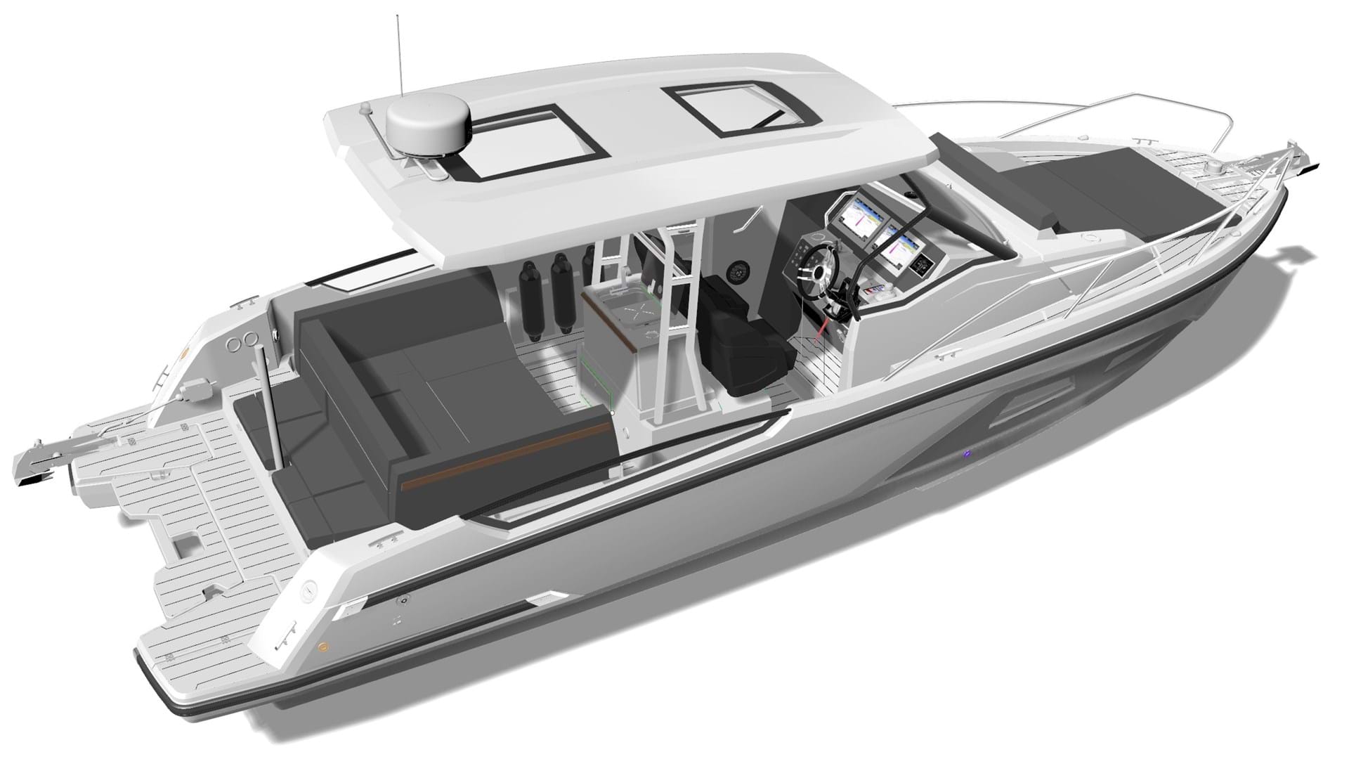 At midday, the shade becomes just as important as the sun. That's where the optional T-top comes in. The rigid roof gives shade at the helm and aft, while the sun sails stretch over the swim platforms and bow sunbed to create a softer cover. The balance between sun and shade is just right. For many, it's the ideal setup: open where you want it, protected where you need it.