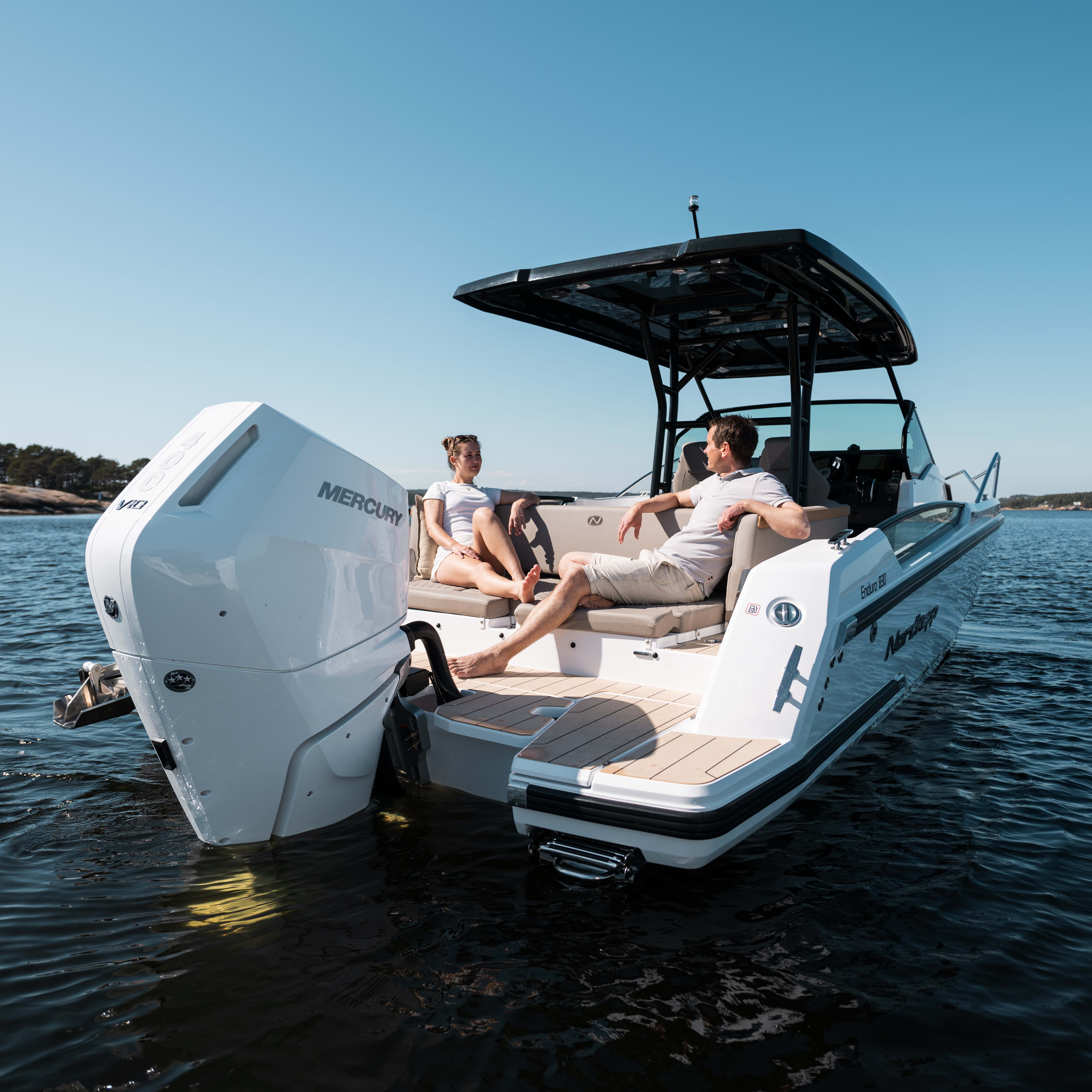 "The test boat had 400 horsepower and reached 47 knots. That gives you more than enough speed and a lively feeling at the helm, while the boat runs quietly and efficiently at 25–30 knots. And that's where you're happiest – with family and friends on board."