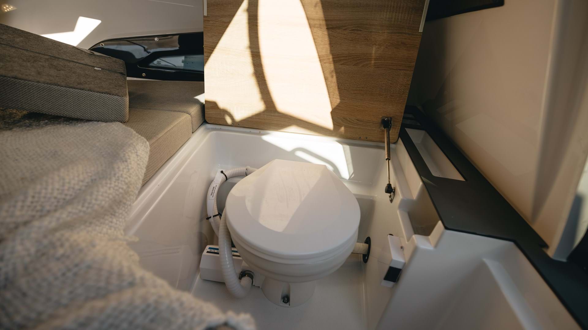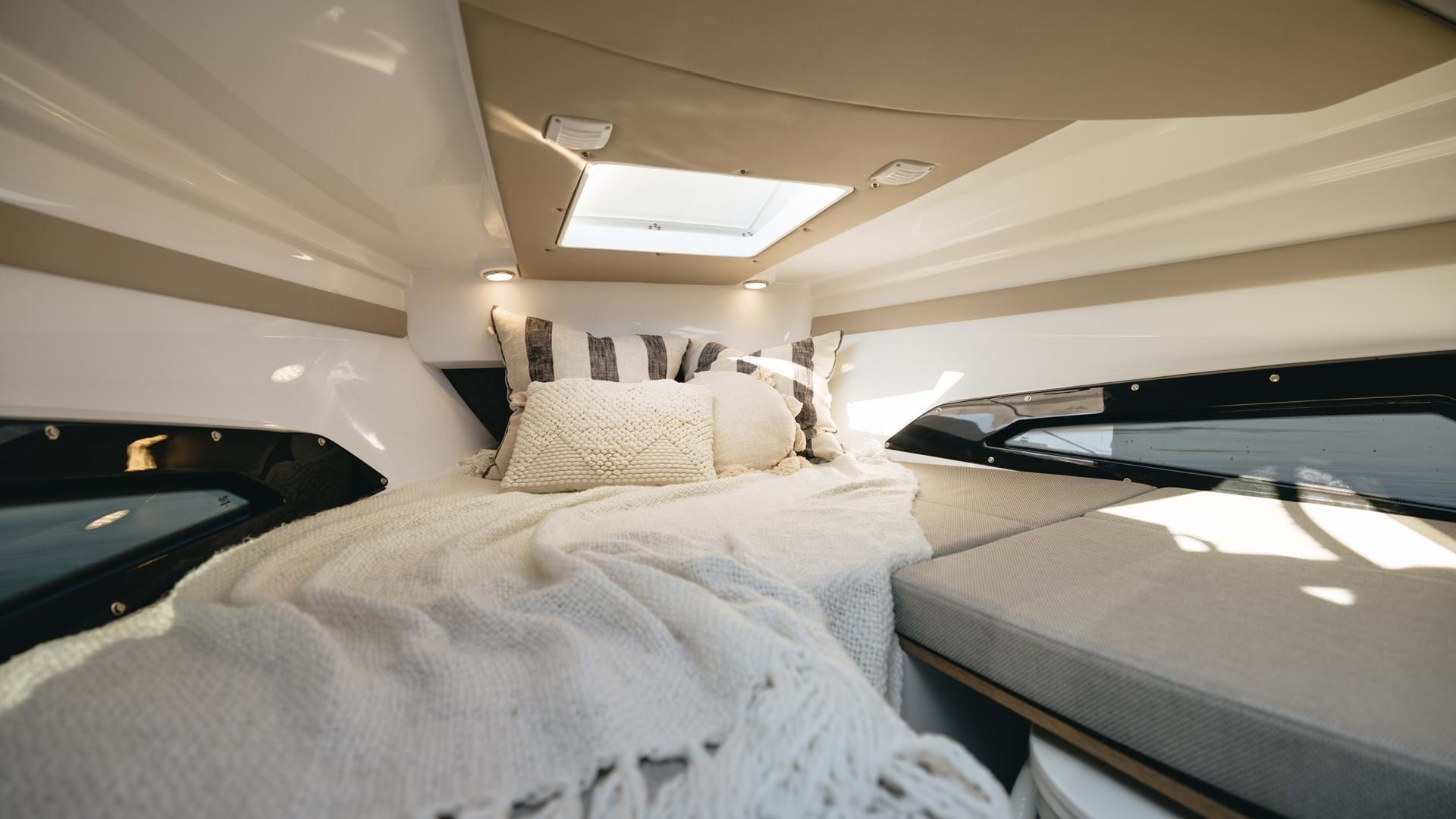 This daycruiser, or cabin cruiser boat, comes into its own during social days at sea. With space for seven people, you can bring friends or family without compromise. Around the table, five adults sit comfortably, thanks to the 2.56-metre beam and the U-shaped sofa. The driver's seat can swivel to face the aft deck, creating one connected space.